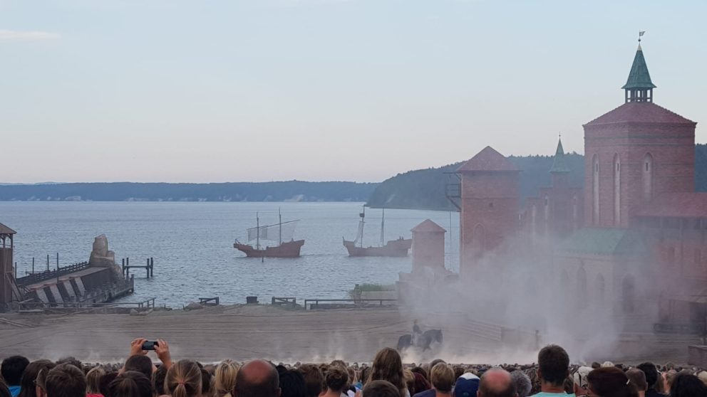 Boah, mehr Wetter geht ja gar nicht! Welch Jahrhundertsommer an der Ostsee – wieder über 30 Grad, wieder Sonne ohne Ende. Da lässt es sich nur in Wassernähe aushalten mit ein paar kleinen Spielchen – und natürlich IM Wasser… 😉 Abends ging’s heute für die Jungs zu den Störtebekerfestspielen, während die Mädels noch einen Film schauten…