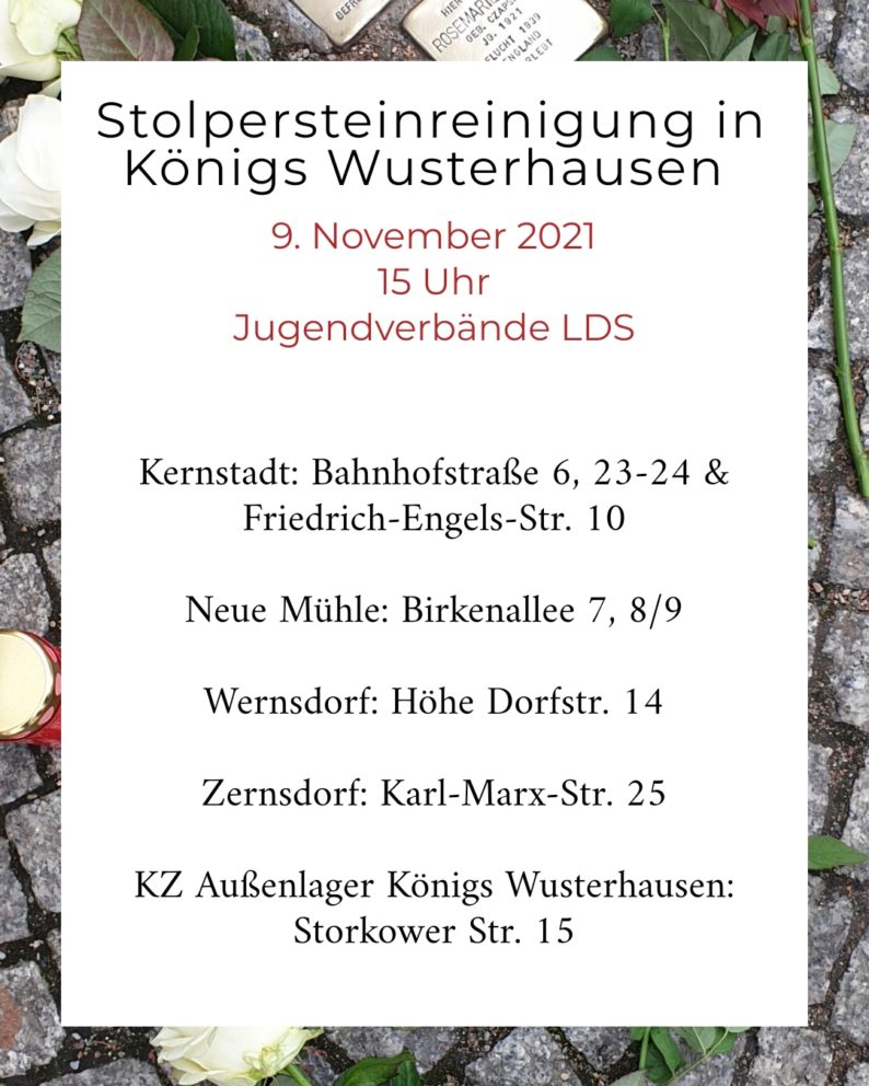 In der Nacht vom 9. auf den 10. November 1938 brannten Nationalsozialisten, unter Beteiligung der SS, SA und Teilen der deutschen Bevölkerung, Synagogen in Deutschland nieder. Sie zerstörten jüdische Geschäfte, Wohnungen und Friedhöfe. Jüdinnen und Juden wurden brutal misshandelt, verhaftet und getötet. Etwa 30.000 jüdische Männer wurden in Konzentrationslagern inhaftiert. Die Jugendverbände LDS erinnern morgen gemeinsam um 15 Uhr in Königs Wusterhausen und Ortsteilen an ehemalige Königs Wusterhausener BürgerInnen, die Opfer des Nationalsozialismus wurden. Gemeinsam verlesen wir morgen an den unten aufgeführten Standorten Kurzbiografien, reinigen die Stolpersteine und rücken die Namen wieder ins Bewusstsein. Wer sich vor Ort gemeinsam mit uns erinnern möchte, ist um 15 Uhr herzlich willkommen. Zusammen tragen wir einen Teil zum gesellschaftlichen Gedächtnis bei und zeigen, dass wir uns erinnern wollen und müssen.